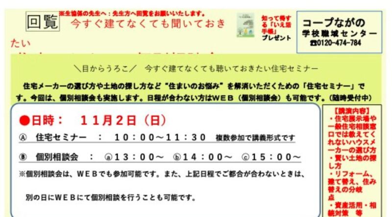 徳島県学校生協・セミナー相談会11月1日「これからの住まい造りセミナー」