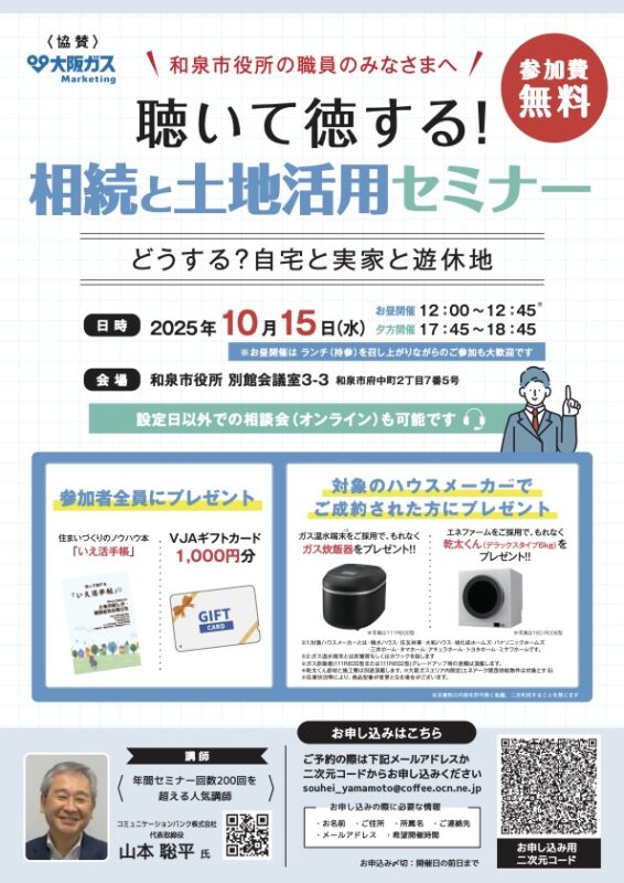 10月15日の和泉市役所「マイホームセミナー」講師をコミュニケーションバンク山本聡平が担当します。