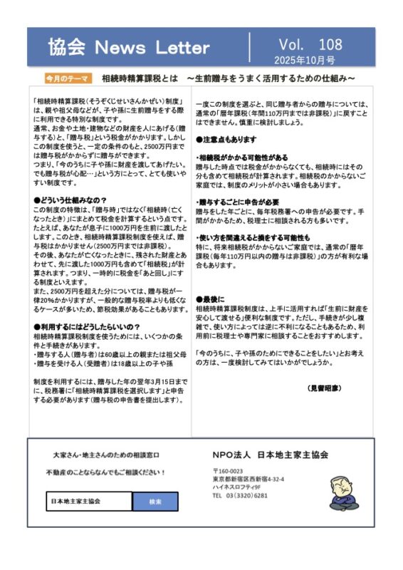 日本地主家主協会NewsLetter (Vol.108) 2025 10/13 目次協会News Letter (Vol.108)「相続時精算課税とは ~生前贈与をうまく活用するための仕組み~」NPO法人日本地主家主協会の「協会News Letter Vol.108」をご覧ください。ご質問等もお待ちしております。PDFはこちらからご覧ください協会 News Letter 一覧 日本地主家主協会NewsLetter (Vol.108) 2025年10月13日 日本地主家主協会NewsLetter (Vol.107) 2025年9月22日 日本地主家主協会NewsLetter (Vol.106) 2025年8月20日 日本地主家主協会NewsLetter (Vol.105) 2025年7月29日 日本地主家主協会NewsLetter (Vol.103) 2025年5月12日 日本地主家主協会NewsLetter (Vol.102) 2025年4月12日 日本地主家主協会NewsLetter一覧 日本地主家主協会「協会NewsLetter」 new