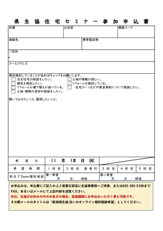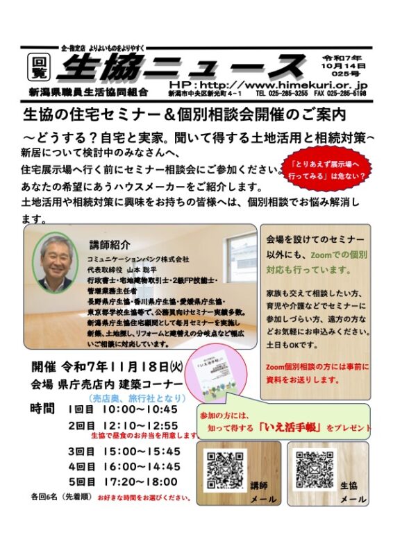 新潟県庁生協・セミナー相談会11月18日 2025 10/13 目次新潟県庁生協「住宅セミナー&個別相談会」11月18日コミュニケーションバンク山本聡平は、新潟県庁生協様主催「住宅セミナー&個別相談会」講師を担当します。お昼休みご参加者様には、昼食弁当がご用意されます。是非ご参加ください。PDFはこちらをクリックしてください 新潟県庁生協・セミナー相談会 new