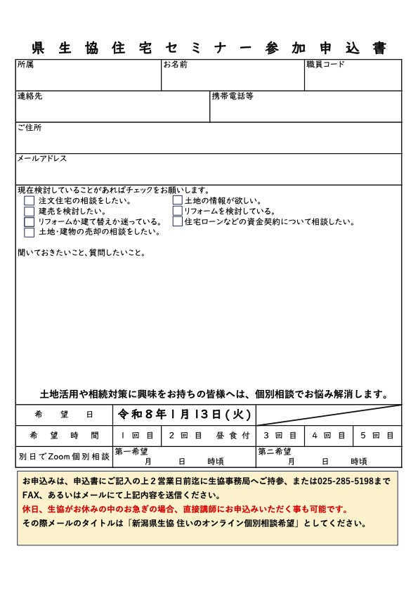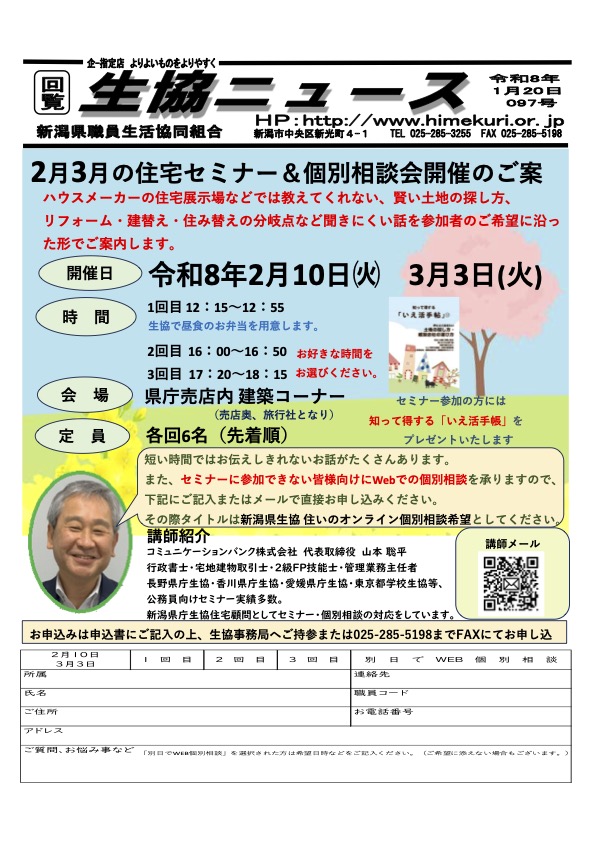 新潟県庁生協・セミナー相談会2月10日 3月3日 2026 1/25 新潟県庁生協「住宅セミナー&個別相談会」2月10日・3月3日コミュニケーションバンク山本聡平は、新潟県庁生協様主催「住宅セミナー&個別相談会」講師を担当します。お昼休みご参加者様には、昼食弁当がご用意されます。是非ご参加ください。PDFはこちらをクリックしてください 新潟県庁生協・セミナー相談会 new