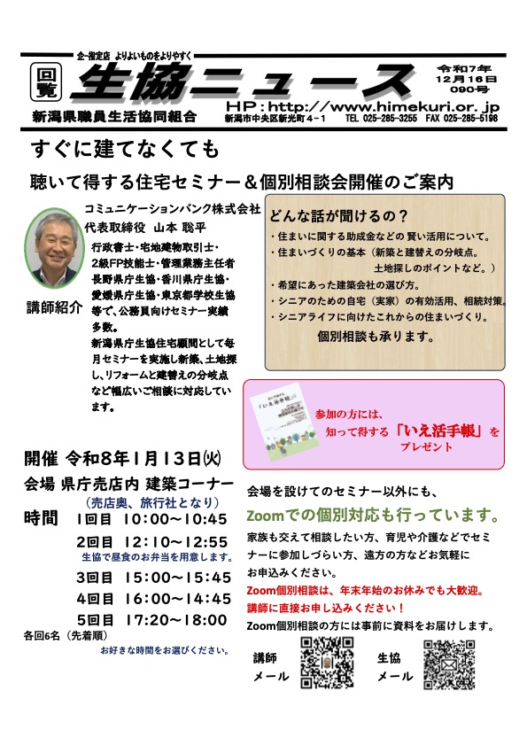 新潟県庁生協・セミナー相談会1月13日 2025 12/29 新潟県庁生協「住宅セミナー&個別相談会」1月13日コミュニケーションバンク山本聡平は、新潟県庁生協様主催「住宅セミナー&個別相談会」講師を担当します。お昼休みご参加者様には、昼食弁当がご用意されます。是非ご参加ください。PDFはこちらをクリックしてください 新潟県庁生協・セミナー相談会 new