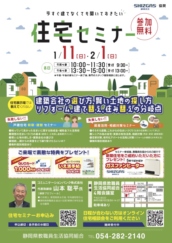 静岡県教職員生協・セミナー相談会 1月 2月 2025 12/28 静岡県教職員生協・セミナー相談会 1月・2月 1月・2月の静岡県教職員生協・セミナー相談会は、静岡ガス様協賛で行われ、参加特典や成約特典が充実しています。 講師を、コミュニケーションバンク山本聡平が担当します。PDFはこちらからご覧ください 静岡県教職員生協・セミナー相談会 new