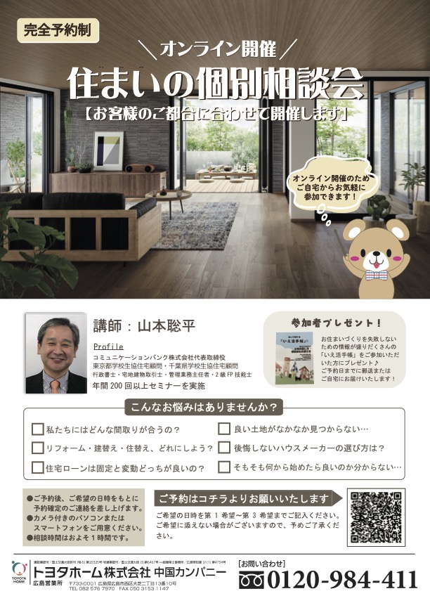 住まいとくらしの相談会 トヨタホーム・オンライン開催・住まいの個別相談会 2026 1/10 「トヨタホーム・オンライン開催・住まいの個別相談会」「トヨタホーム・オンライン開催・住まいの個別相談会」講師をコミュニケーションバンク山本が担当します。申込はトヨタホーム様へPDFはこちらをクリックしてください 住まいとくらしの相談会 new