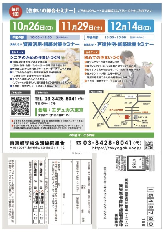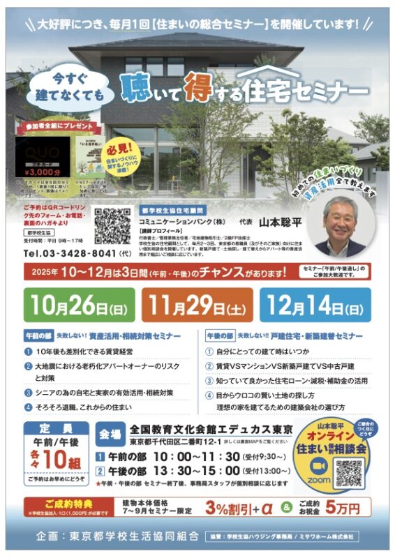 ミュニケーションバンク山本聡平は、東京都学校生協様主催「住まい総合セミナー」と「個別相談会」の講師を担当します。個別相談会は、じっくりお話をお伺いしてアドバイス申し上げます。お申し込みは、東京都学校生協様へ。